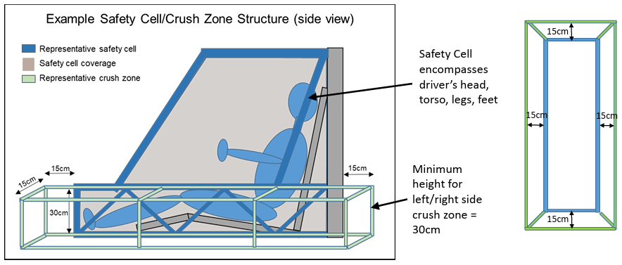 Rule 5.2.3 provides that a crush zone is defined as structural components outside of the safety cell that are designed to collapse in an effort to absorb some of the impact from a collision without impacting the driver space. The crush zone must provide driver and battery protection from front, side, and rear collisions